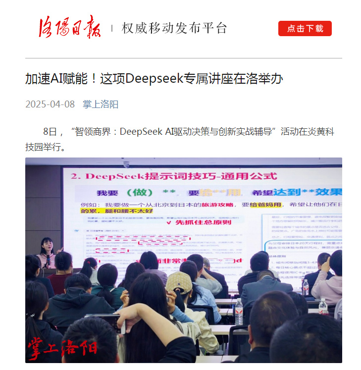 4月8日,“智領商界:DeepSeek AI驅(qū)動決策與創(chuàng)新實戰(zhàn)輔導”培訓活動在炎黃科技園舉行,轉(zhuǎn)發(fā)洛陽日報、中華網(wǎng)的相關報道——