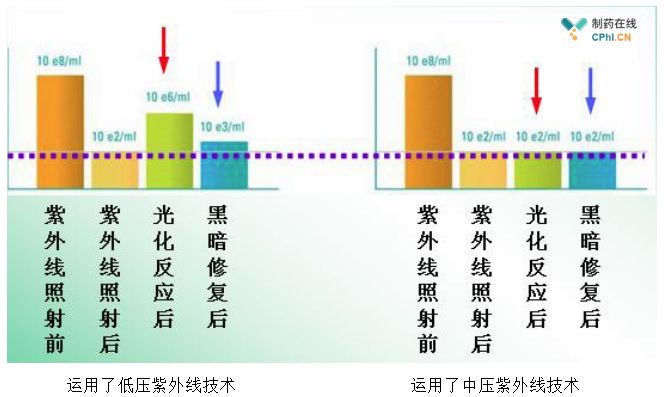 實驗前,培養皿中均有 這個數量級的大腸桿菌,經紫外線照射后,大腸桿菌迅速下降 。試驗顯示,受到低壓紫外線照射后的大腸桿菌迅速的復活和再生,能反彈至 數量級(有光條件下)。而受到中壓紫外線照射后的大腸桿菌,無論是在有光或是黑暗的情況下,復活和再生反應都完全無法進行。因此,從上述試驗結果提示 ,中壓紫外線技術是一種比低壓紫外線更持久的,更有效的殺菌技術,