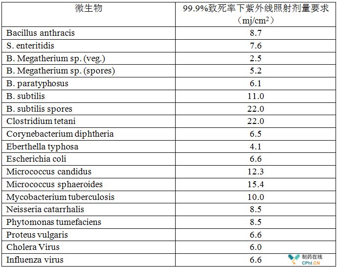 殺菌效果是由微生物所接受的照射劑量決定的,表一是不同微生物對于紫外線輻射劑量的要求。